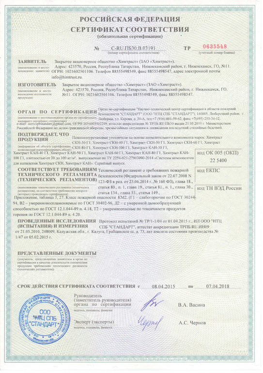 Пенополиуретан (ППУ) является самозатухающим и трудновоспламеняемым материалом. Он не поддерживает горение (Г2) и имеет класс пожарной опасности КМ3 - практически не выделяет вредных веществ.