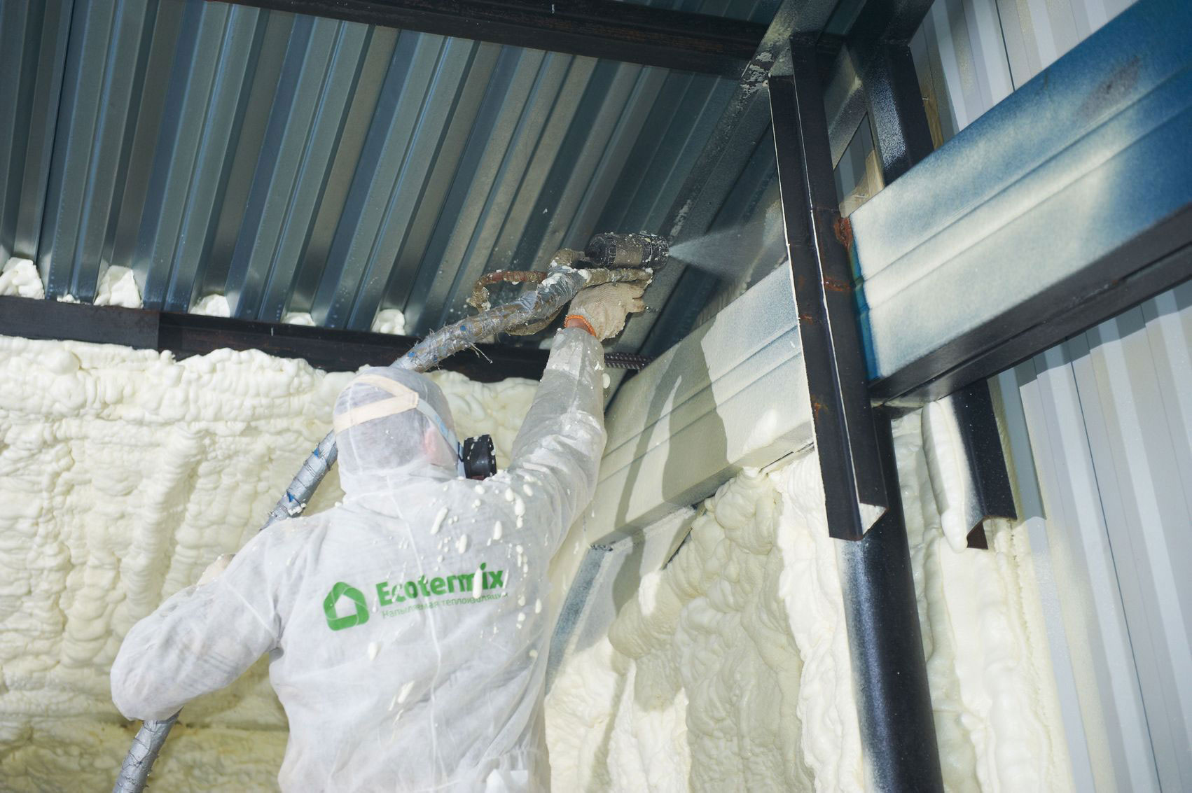 По желанию Заказчика мы производим работы по монтажу напыляемой полиуретановой (ППУ) теплоизоляции с применением